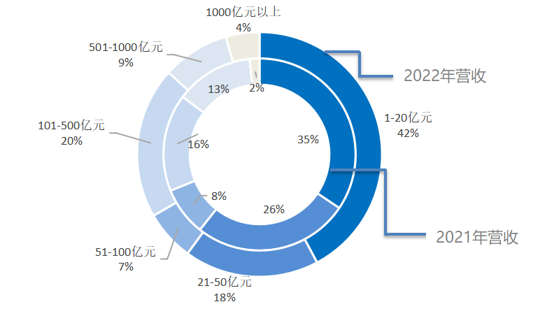 停业收入方面,100多家预制菜头部企业中,仅有61家企业披露了2021年的企业营收,45家披露了2022年的企业营收,对这些企业营收数据进行统计阐发,发觉2021年的企业营收数据中,50亿元营收以内的企业占比跨越六成;500亿元以上的企业占比力少,仅有15%。2022年的企业营收数据取2021年类似,50亿元营收以内的企业占比约六成;100亿元以上的企业仅占比三成多,此中100-500亿元的企业占比相较2021年有所添加,达20%,500亿元以上的企业仍较少,仅有13%。