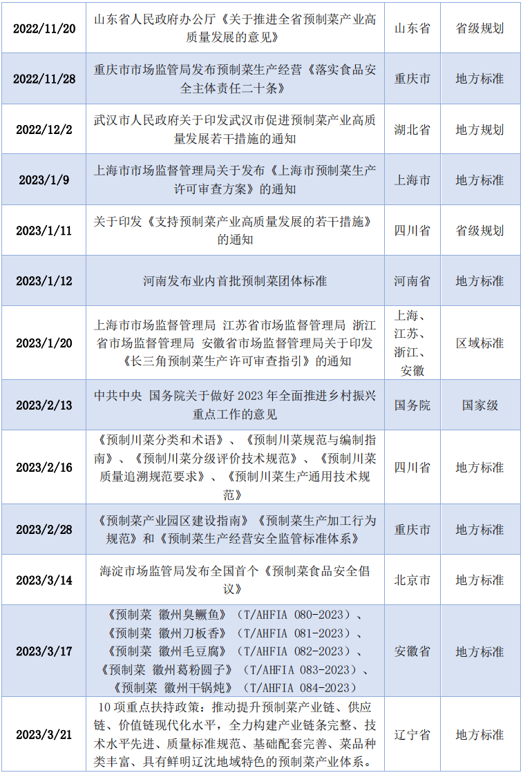 图2-2 中国预制菜行业财产链示企图(图片来自艾媒征询《2022年中国预制菜财产成长》)目前,除了原料供应企业、预制菜专业出产企业、速冻食物企业、连锁餐饮企业和商超零售类企业等行业次要参取者,还有良多企业跨界插手,积极转型结构预制菜范畴,开展相关出产运营。如格力电器、老板电器、海容冷链等企业从预制菜出产制制设备、冷链物流设备等电器出产范畴切入预制菜财产;外卖、商超、生鲜电商等平台也纷纷入局,如饿了么成立特地团队优化细分行业运营,美团买菜、叮咚买菜等电商平台上也将预制菜正在商品分类中单列出来;还有不少看起来取预制菜行业“毫不相关”的企业,则借帮行业成熟的供应链,选择以产物为抓手,间接创立预制菜品牌。如地产巨头碧桂园集团进军预制菜财产,旗下广东碧乡科技成长无限公司推出“食机已道”系列鲟鱼预制菜品;快递行业龙头顺丰也颁布发表推出预制菜行业供应链处理方案,全面结构预制菜。预制菜财产链条长,正在推进农产物深加工、食物制制转型、消费升级、创业就业等方面均具有积极意义,近年来各地部分连续出台政策进行指导、激励和规范。2022年以来,广东、山东、四川、沉庆、福建、浙江、江西、上海、辽宁等多个省市接踵出台预制菜相关财产的政策指点文件,内容次要环绕冷链扶植、企业培育、税收优惠、人才培育、消费补助、品牌打制、财产园扶植和办理等方面。除了政策办法,从地方四处所,预制菜财产相关的尺度规范也连续出台。2022年6月,中国饭馆协会发布《预制菜质量分级及评价》和《预制菜出产质量办理手艺规范》集体尺度,为预制菜的尺度化出产供给了支持;2022年5月,江苏省餐饮办事尺度化手艺委员会、江苏省餐饮协会牵头发布《预制菜点质量评价规范》集体尺度;2022年11月,市场监管局发布预制菜出产运营《落实食物平安从体义务二十条》;2023年1月,上海市市场监视办理局关于发布《上海市预制菜出产许可审查方案》的通知等。